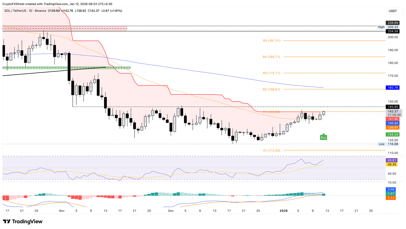 SOL is trading above the R1 Pivot Point at $142 on the daily chart. The Supertrend indicator crossed into bullish territory, generating a buy signal. This technical setup suggests upward momentum.