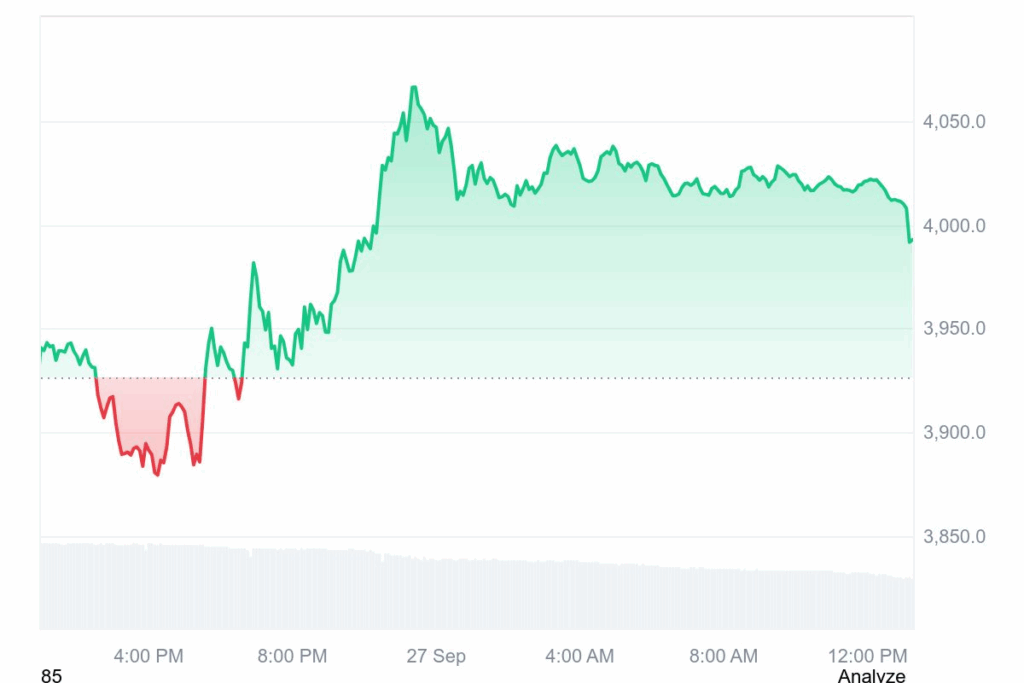 At the time of writing, Ethereum (ETH) is trading at $4,992 and has recorded a 24-hour trading volume of $56.91 billion with a market capitalization of $485.15 billion. The ETH has increased by 1.31% over the past 24 hours while holding stable above the critical $4,000 level.