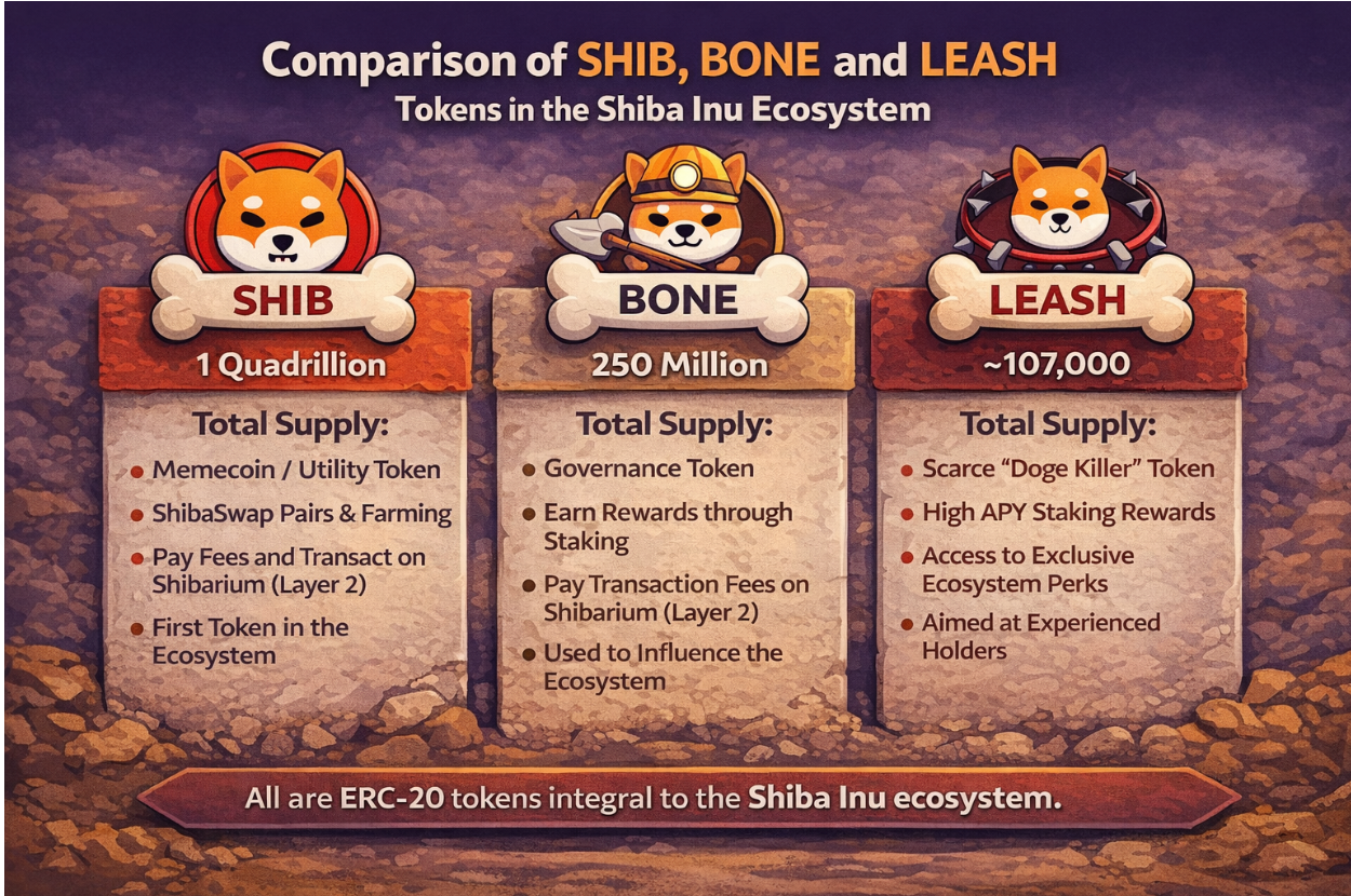 Comparison chart of SHIB, BONE, and LEASH token supplies, utilities, and roles within the Shiba Inu ecosystem.