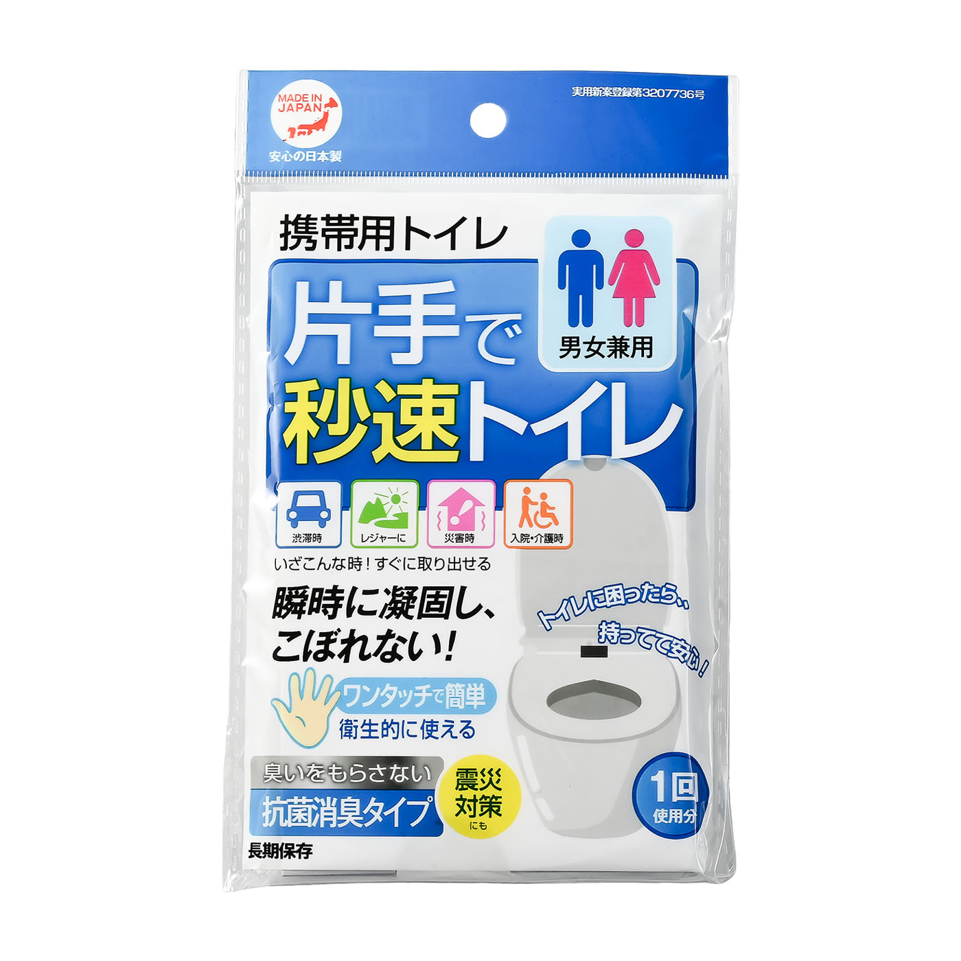 トパックの「片手で秒速トイレ」は、10年保存対応で長期保存ができる日本製の商品です。凝固速度を検証したところ、モニター10人が平均約18秒で処理可能と判断したため、固まる速度は早く待つ時間が少ない印象。さらに、防臭力の検証でも高評価を獲得。使用後のにおいがほとんど感じられず、消臭剤の効果も長続きしているため、すぐに廃棄できなくても不快感を感じにくいでしょう。受け口の大きさについても、15cmと広く開けられるため、男性だけでなく女性でも使用しやすいといえます。狭い空間や車内などでも漏れる心配を少なくできるのは魅力。一方で、使いやすさに関しては評価が伸びず。凝固剤を別途取り出して入れる手間があることや、ビニール袋が透明で中身が丸見えであることが気になりました。廃棄の際には、周囲への配慮や視線を考慮し、外づけの黒い袋を使用しましょう。