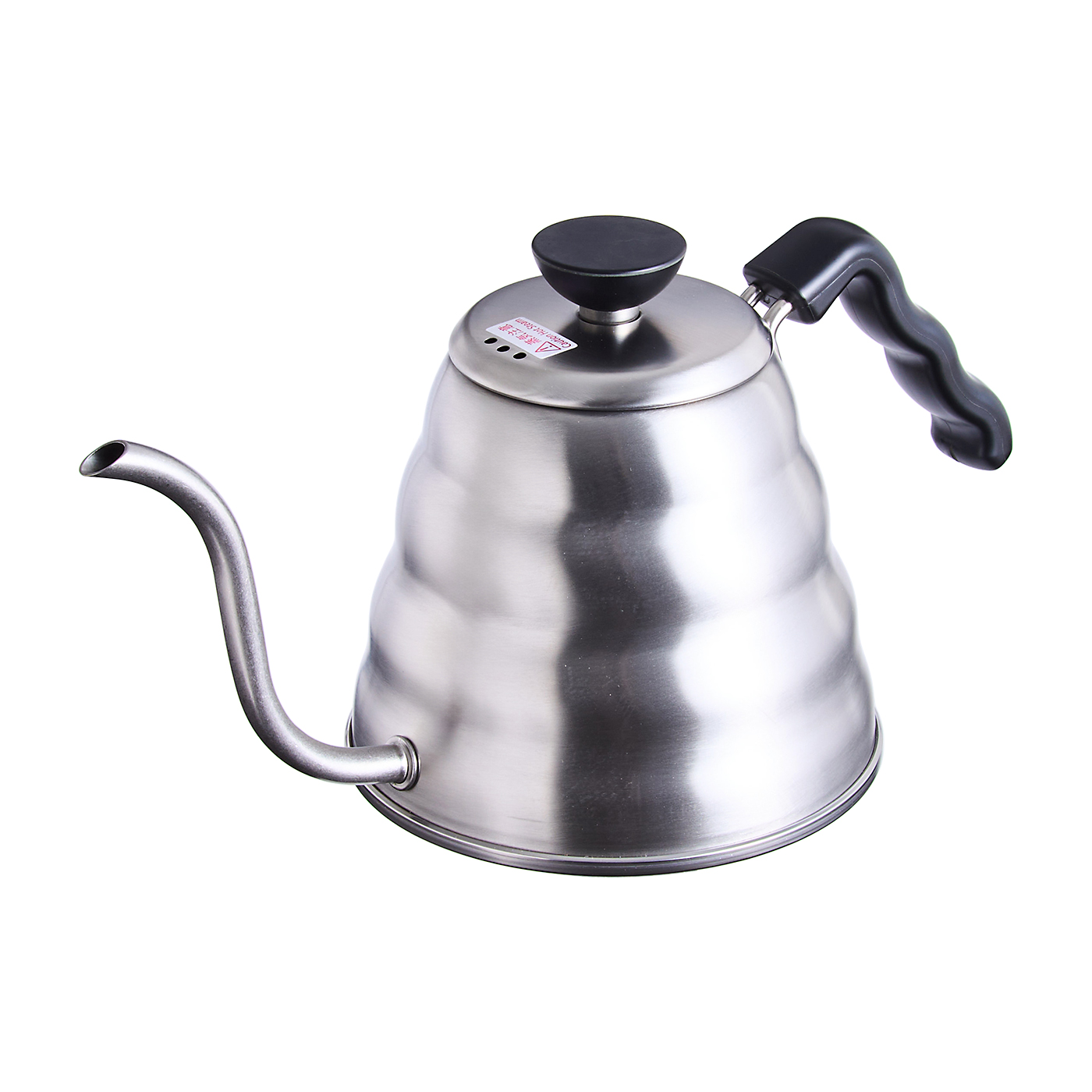 竹井器物製作所の「フィーノ ドリップポット」は、新潟県燕市で製造された日本製のドリップポットです。容量は1Lと1.2Lの種類を展開。18-8ステンレス製の本体と18-0ステンレス製の底板を使用し、ガスコンロ・IHを含むあらゆる熱源に対応できます。ハンドドリップのしやすさが際立つ商品です。細口ノズルを採用しており、お湯の量を細かくコントロールしやすい点が魅力。さらに、注ぎ口が下向きになっているため、狙った場所に正確に注げます。本体の重さは394gと軽めで、手首への負担も少ないでしょう。スピーディにお湯が沸かせる点もメリットのひとつです。沸騰するまでにかかった時間は2分44秒と短く、忙しい朝でもすぐに使えます。フタが外せるうえ丸洗いできるため、日々の手入れも簡単。清潔に使い続けたい人にもぴったりです。一方で、沸騰時に持ち手が熱くなりやすく、布巾を使わないと持てない場面がありました。また、電気ケトルとは異なり温度調節機能がないので、機能性を求める人には不向きな可能性があるでしょう。