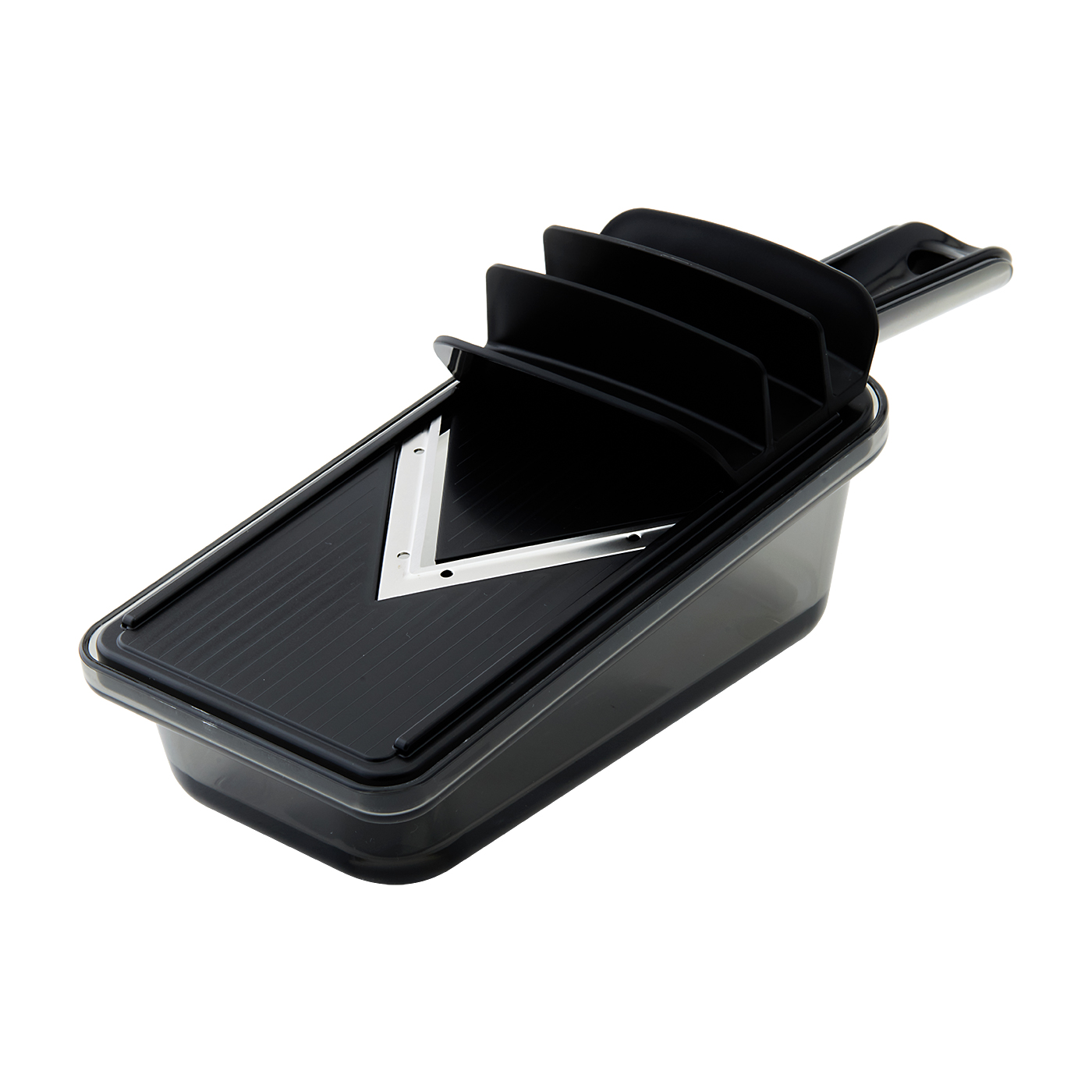 貝印の「調理器セット」は、「使いやすい道具はシンプルで美しく、手になじむ」をコンセプトにしたSELECT100シリーズの商品。スライス・千切り・細千切り・おろし用のパーツが含まれています。千切りの切れ味が高評価で、モニターからは「引っかかりはまったくなく、連続して千切りできた」「長時間使っても疲れにくそう」という声が挙がりました。硬いにんじんにも刃が入りやすく、スピーディに千切りできる印象です。一方、スライスの切れ味は、玉ねぎ・じゃがいもは好評。モニターから「軽い力で切れて力はほぼ不要」「気持ちよくスパスパ切れた」と評価されました。しかし、キャベツは「すべりが悪くうまく切れなかった」「切り始めに引っかかりを感じやすく、力が入った」という声があり、全体の評価が伸び悩む結果に。底面の四隅にすべり止めがついており安定感があり、指ガード(安全ホルダー)がついているのでケガのリスクも軽減できます。パーツはすべて本体の中に収納でき、すっきりまとめられるでしょう。根菜の千切りを楽に行いたい人におすすめのスライサーです。