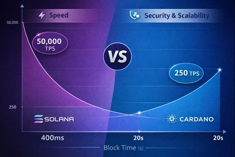 Q: What is the key difference between Solana and Cardano? A: Solana focuses on speed and high throughput, whereas Cardano prioritizes security, decentralization, and scientifically-backed governance through its Ouroboros PoS protocol.