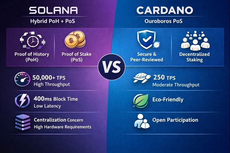 • Solana vs. Cardano: Solana focuses on high throughput and speed using Proof-of-History (PoH), while Cardano emphasizes security, decentralization, and sustainability through its Proof-of-Stake (PoS) model.