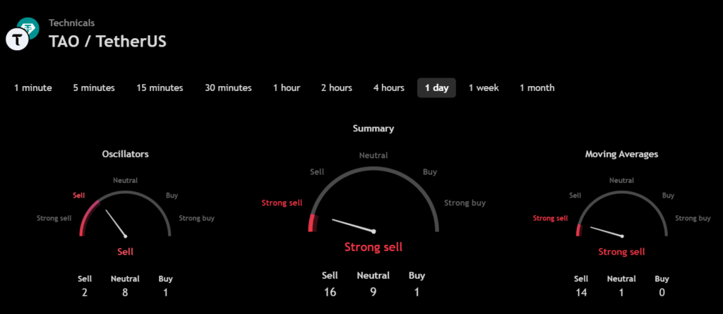 The technical analysis indicators such as Relative Volume (RVOL), Moving Average (MA), and Relative Strength Index (RSI) of Bittensor (TAO) are shown in the chart below.