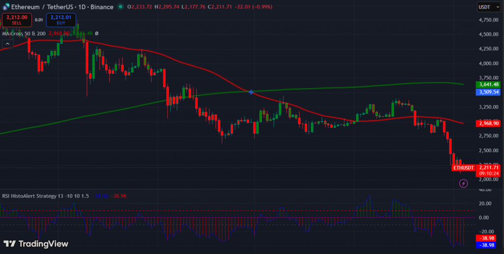 According to the ETH/USDT daily price chart, Ethereum remains in a descending channel on the daily timeframe, characterized by lower highs and lower lows since failing to hold above the $3,000 level. The 50-day moving average ($2,968.90) has recently crossed below the 200-day average ($3,509.54), forming a “death cross”, a classic warning signal often associated with extended declines. Price currently trades well below both moving averages, underscoring the prevailing downtrend.