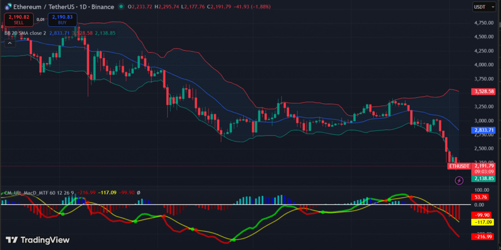 Bollinger Bands also reflect continued weakness. The middle band (20-day SMA) is near $2,833.71, while the lower band sits at $2,138.85. ETH briefly traded close to the lower band, suggesting strong selling pressure, though the slight rebound indicates short-term stabilization rather than a confirmed recovery.