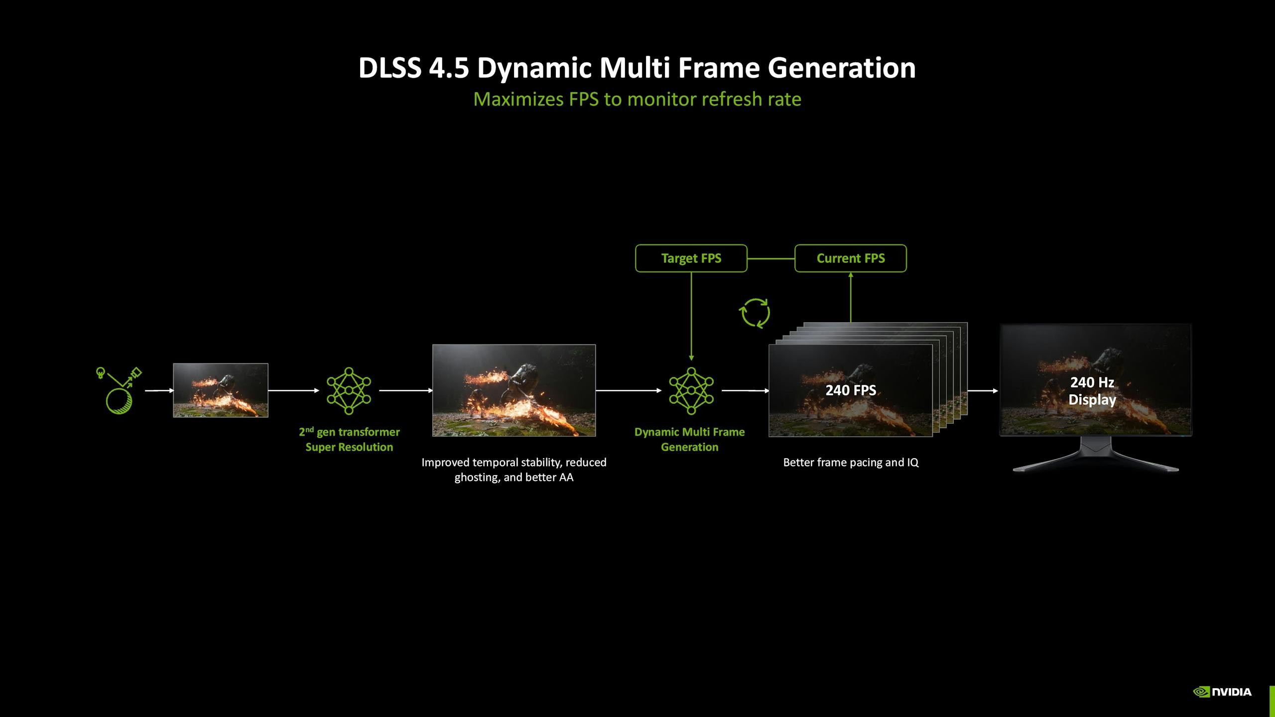 由GeForce RTX 50獨佔的DLSS多幀生成功能也迎來功能升級,除了繼現行可產生額外3幀升級到額外5幀的6倍幀生成,還加入全新的動態幀生成功能,此功能可依據顯示器的最大更新率、遊戲的延遲等條件,動態調整幀生成的倍率,或於過場等偏向靜態影像時不進行幀生成,使體驗與運算進一步最佳化。