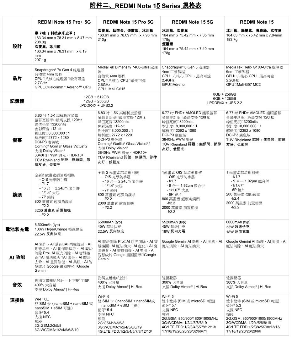 其中Redmi Note 15 Pro+ 5G搭載6.83吋1.5K 120Hz螢幕,玻璃為四邊微曲面,處理器為高通Snapdragon 7s Gen 4,配有2億畫素主鏡頭、800萬畫素超廣角鏡頭與32MP前鏡頭;Redmi Note 15 Pro 5G則搭載6.83吋1.5K 120Hz螢幕,玻璃為平面,採用聯發科天璣7400-Ultra處理器,配有2億畫素主鏡頭、800萬畫素超廣角鏡頭與20MP前鏡頭。值得注意的是兩款機型的第2 SIM可選擇使用實體卡或切換至eSIM,Redmi Note 15 Pro 5G的Google錢包還額外支援iPass一卡通功能。